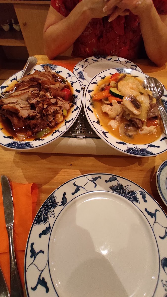 Getränke hatten leider kaum bis keine Kohlensäure und waren auch nicht wirklich kalt. Wir hatten Ente mit Cashewnüssen und Ente in Erdnusssauce. Das Fleisch war etwas trocken, das Gemüse aber knackig und die Soße prima. Die Pekingsuppe war ebenfalls sehr lecker und richtig heiß. Es hat uns wirklich gut geschmeckt. Man ist bemüht, höflich und zügig zu bedienen. Insgesamt war es eine gute Erfahrung. Abholung haben wir in letzter Zeit nicht ausprobiert. Soll ja nicht so toll sein. Wir schauen uns das demnächst mal an.