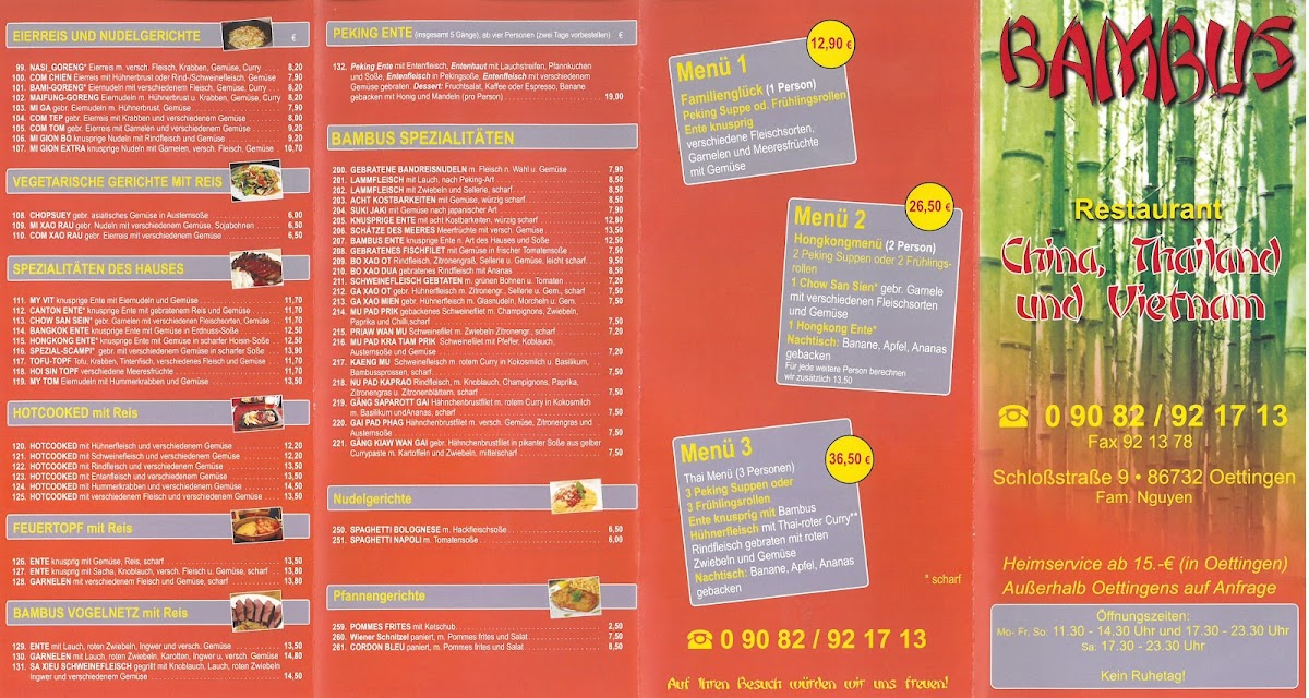 Welcome to Restaurant Bambus in Oettingen, a gem nestled in the heart of Germany, specializing in authentic Chinese cuisine. From the moment you step in, you're enveloped in a warm, inviting atmosphere. The menu boasts an array of dishes that intrigue and delight, showcasing the skill of their chefs. Diners rave about the crispy duck served with a carefully crafted sauce in an extra dish, ensuring every bite remains perfectly balanced with flavor and texture. Highlights also include the delicious Peking soup and notable vegetarian options featuring fresh, crunchy vegetables.